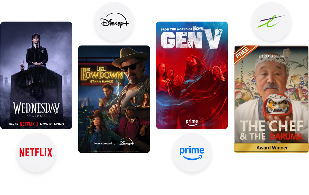 Grâce à EnContinu+, vous pouvez profiter d’économies exclusives sur Netflix, Disney+ et Amazon Prime. De plus, profitez du service Films et séries de TELUS et de plus de 50 chaînes de diffusion en continu gratuites.