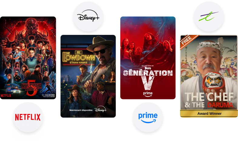 Accédez à des économies exclusives sur Netflix, Disney+ et Amazon Prime, en plus de Films et séries de TELUS et de 40+ chaînes gratuites.